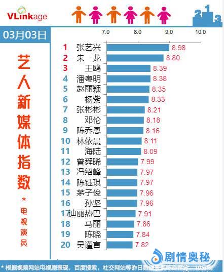 这个榜单是根据视频网站电视剧表现,百度搜索,社交平台等数据进行综合评分得出的,每天会更新一次,算是比较客观反应电视演员的人气动向。