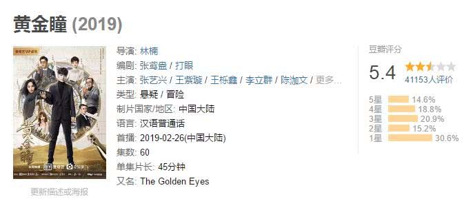《黄金瞳》是一部都市探险剧,既有都市时尚和俊男美女的高颜值,又不缺乏探险悬疑的元素,张艺兴在剧中的演技,比起以往要自然很多,眼神也可以有戏,但该剧在豆瓣上的评分只有5.4。