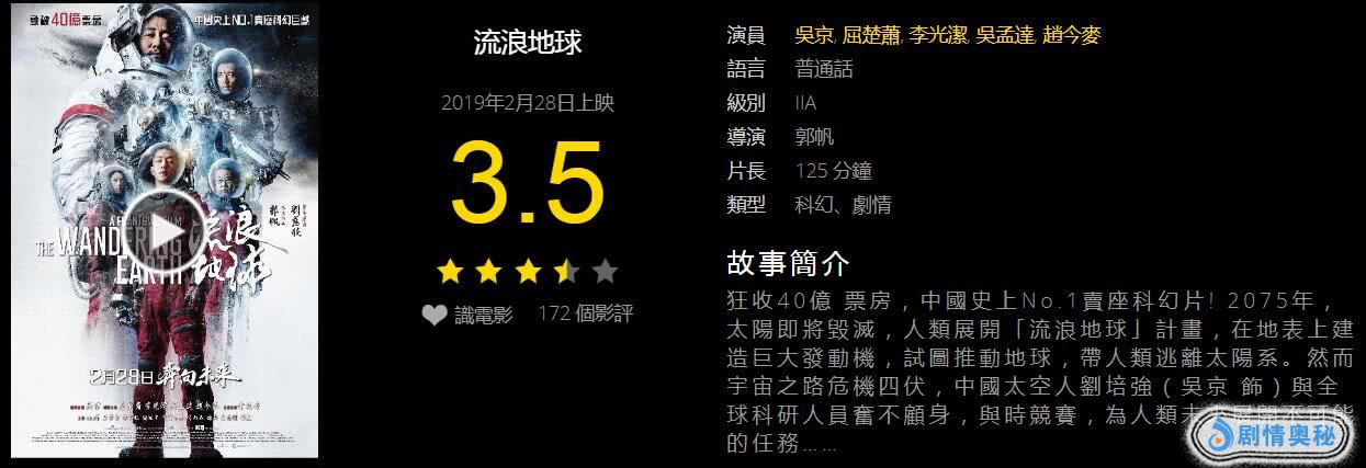 《流浪地球》在香港原本可以卖得更好,但没想到上映后遭到部分人的“抵制”,这点从口碑评分就能体现出来。“小破球”首日观众打出4.2高分(满分5颗星),但没两日分数就跌破到3.7分,目前又下跌到只有3.5分。吴京新片错失春节黄金假期,现在又遭到口碑恶意差评,不少香港观众还是带“有色眼镜”来对待国产片啊!