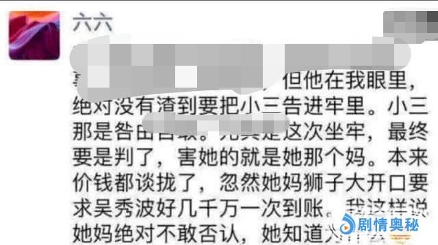 据吴秀波方的人六六透露出,原本吴秀波是想与陈昱霖和和解的,当初没想把她告入狱,连分手费都是已经谈好的了,但是陈昱霖父母却嫌少,一次就要吴秀波几千万,为此吴秀波才把陈昱霖给告了。而这件事陈昱霖的父母是很清楚的,她绝不敢否认。