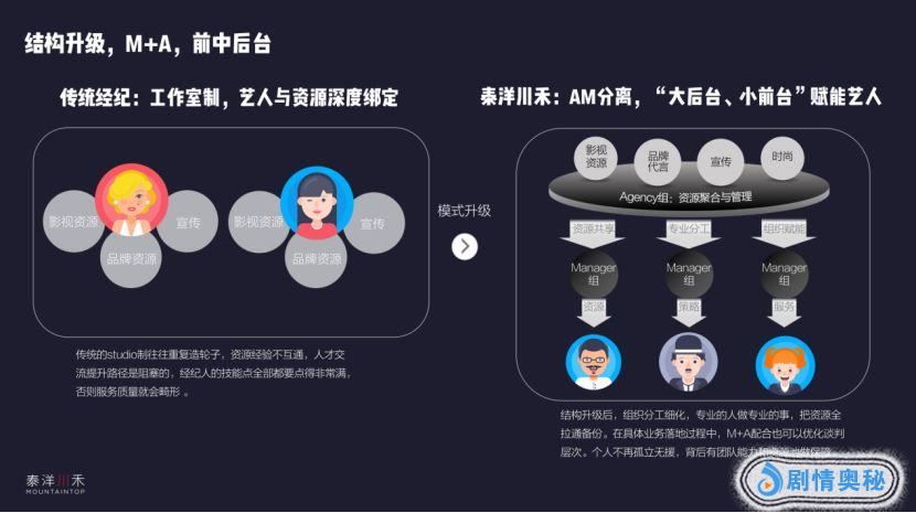 在过去的2018年,泰洋川禾进行了两次组织架构调整,将原有各自为战的艺人工作室进行优化,成为如今基于CAA模式进行创新的“Manager+Agent”服务体系:前台Manager服务于艺人,为其制定全方位的发展规划;后台Agent面向内容资源与品牌,专注拓展对外资源,通过专业分工和共享资源更好赋能于艺人和客户,从而实现公司对签约艺人的规模化运营。