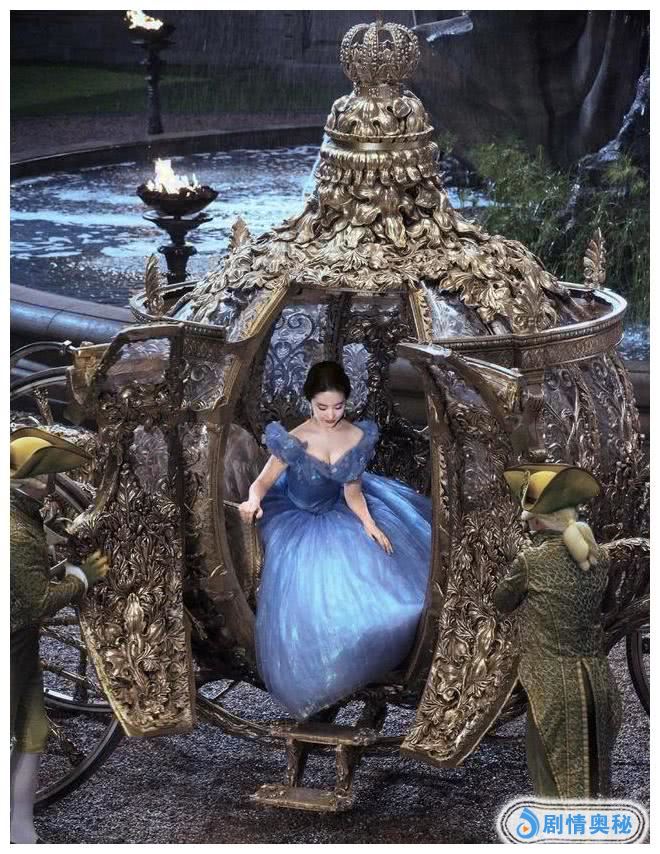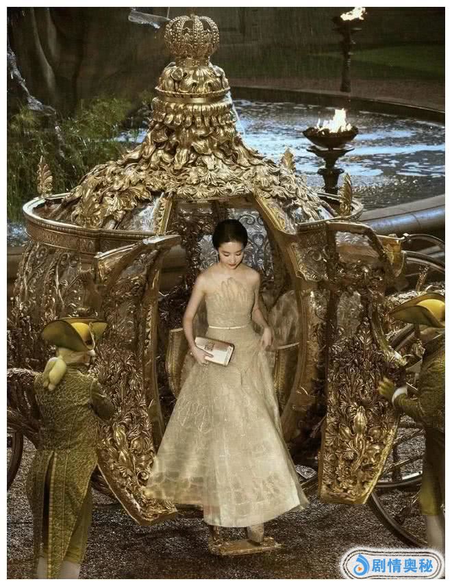 还有这张,换了一身金色抹胸裙的刘亦菲,正提着裙摆,缓缓步下南瓜车,简单盘着的头发,无需任何装饰,就展现出一种高贵的美,咋一看,还以为回到了西方贵族时代,她这是正准备去参加一个高级舞会呢!