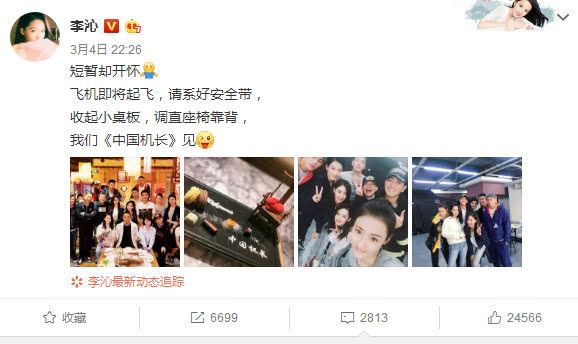 3月4号晚上10点26分,李沁在社交平台发布消息,晒出来了《中国机长》杀青大合照!李沁说飞机即将起飞,请系好安全带,我们《中国机长》见!该片取材于川航迫降这一件真实案例,机长刘传建被盛赞为中国英雄机长。