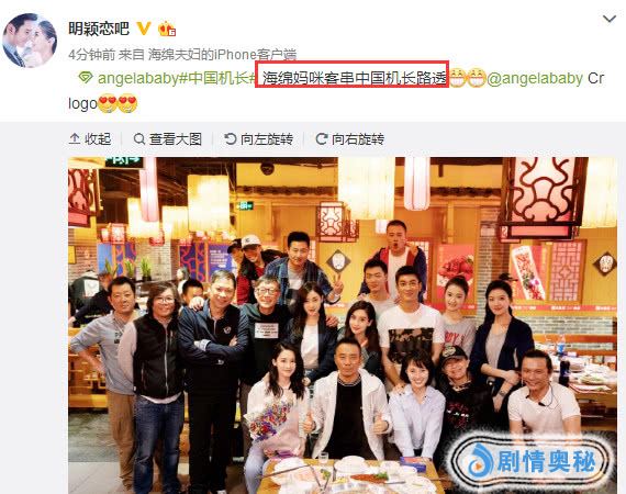 什么情况?baby去参演了《中国机长》?还是仅仅去剧组探班好朋友呢?就在3月5号早上,“明颖恋吧”发布消息:海绵妈咪客串中国机长路透!