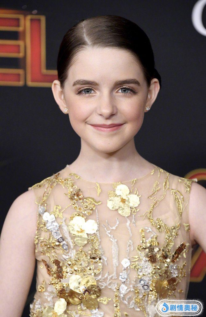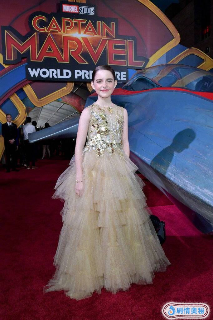 今天小惊奇队长也来到了电影的首映礼上,同样是一款浅色长裙,上面各种小亮片闪烁,还是蓬蓬裙,就像是一个小公主。不得不说,惊奇队长小时候长得真是太可爱了。