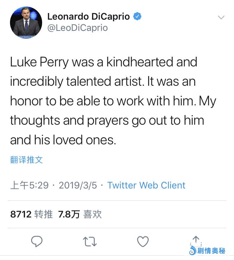 在得知贝里离世的消息后,不少好莱坞明星纷纷表示惋惜。莱昂纳多·迪卡普里奥在社交平台发文,对好友的离世沉痛哀悼。他表示,贝里是一个非常有才华并且十分善良的演员和艺术家,能够和他工作是一件很荣幸的事,“我的心将和贝里的家人一起为他祈祷。”