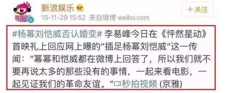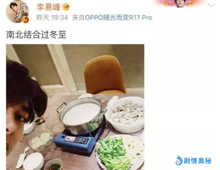 刘恺威杨幂离婚当天,李易峰刚好发了一条微博,称“南北结合过冬至”,被网友解读为“李易峰是成都人(南方),杨幂是北京人(北方),所以李易峰这是在隐晦地向杨幂示爱。”