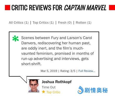 3月5日《惊奇队长》首映后一个媒体评价偷跑,来自《Time Out》影评人Joshua Rothkopf为电影打出了60/100分,此评论由于态度比较负面,被烂番茄列为差评。