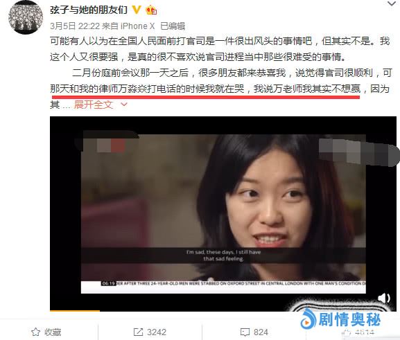 “弦子与她的朋友们”发文说:二月份庭前会议那一天之后,很多朋友都来恭喜我,说觉得官司很顺利,可那天和我的律师万淼焱打电话的时候我就在哭,我说万老师我其实不想赢。
