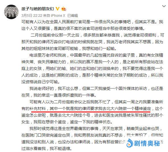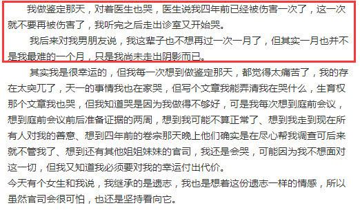 她表示在补充材料时,被律师要求去医院做一个精神鉴定,于是她就去了北大六院挂号鉴定了精神状态。还说当天面对医生时都在哭,承认自己尚未走出阴影。