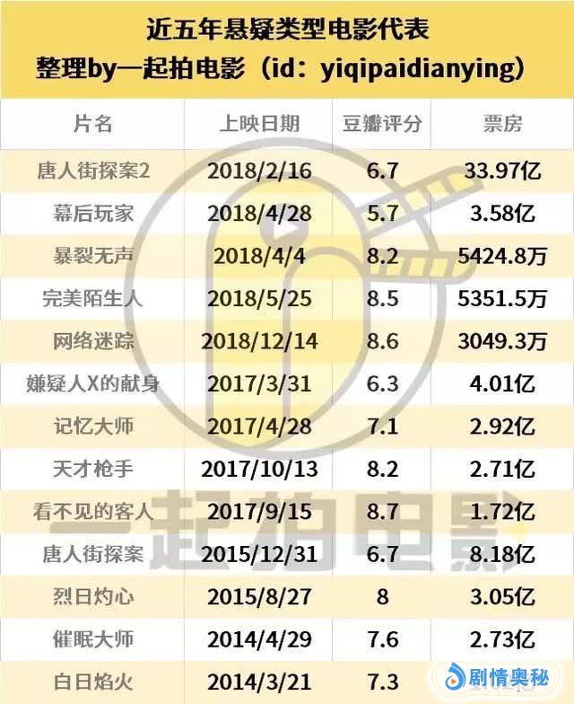 综合近五年市场上的悬疑类定电影代表作品来看,优质作品逐年增加,同时国产电影和引进片全面开花。在国产创作方面,如陈正道主导的“大师”系列、陈思诚开创的“唐人街探案”系列,均是近年来票房口碑双丰收的典型代表,其中《唐人街探案》更是凭借33.97亿高票房位列2018年电影票房总榜第二,而2014年的《白日焰火》则在当年的柏林电影节上大放异彩,不仅将金熊奖最佳影片收入囊中,更成就了廖凡的影帝之旅,同样的,2015年曹保平推出的《烈日灼心》也同样将邓超、段奕宏和郭涛三人一同送上当年上海电影节的影帝宝座;