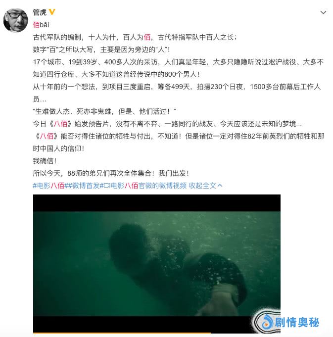 继电影《老炮儿》之后,导演管虎推出了新的作品《八佰》,电影《八佰》以1937年淞沪会战时发生在上海的四行仓库保卫战为主题。讲述了800名中国将士拼死守护位于上海苏州河北岸的四行仓库整整四天四夜,抵挡住日军的多番进攻的悲壮故事。