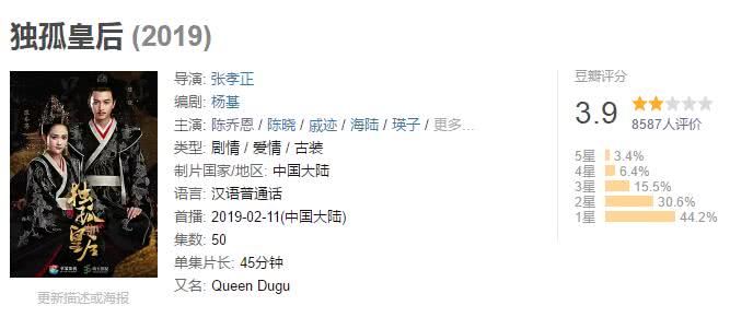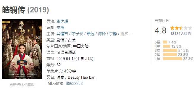 这个4.8分如果放在去年,也不能说是烂剧,可是在2019年基本都是6分,7分,甚至还有8分剧扎堆的时候,确实可以说不尽人意了,这部剧被吐槽的不止是过度扭曲历史,还有就是女主演技和让人容易出戏的台词。