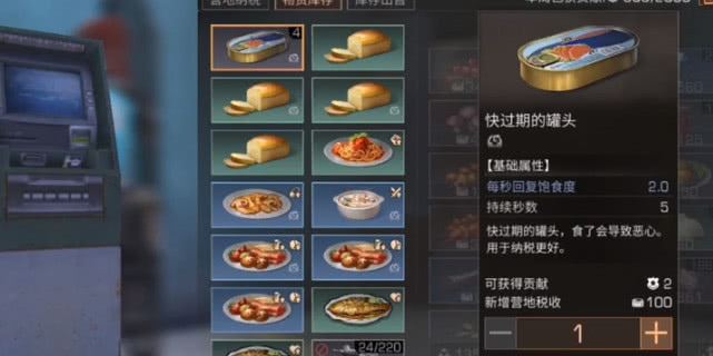 最后的话还有一种名为快过期的罐头,这种快过期的罐头吃了之后会导致恶心,所以也会对我们的饱腹感和健康值降低,但是上面却写着可以贡献给营地,那么这种过期罐头贡献给营地之后会有多少贡献值呢?每个罐头其实只有两点,所以也不是太多的。