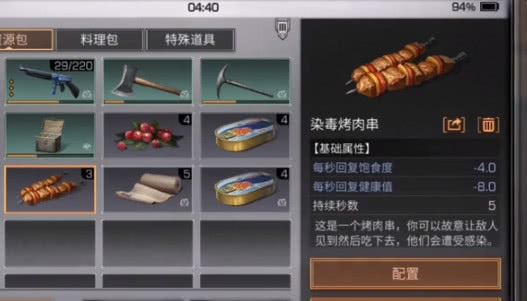 烤肉串是一种非常良心的食物,在前期经常会使用烤肉串,一只烤肉串可以增加十点的血量,饱腹感也可以增加32.5。但是如果你用感染的肉去做了染毒烤肉串,那么效果就相反了,属性就是每秒减少四点,饥饿值减少八点健康只持续五秒。