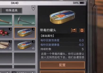 我们在开宝箱的时候经常可以获得罐头,但是在使用之前你可一定要看清楚了,有一种带毒的罐头效果是每秒增加六点饥饿值,减少六点健康值持续五秒,所以这是和正常罐头起到相反作用的食品。
