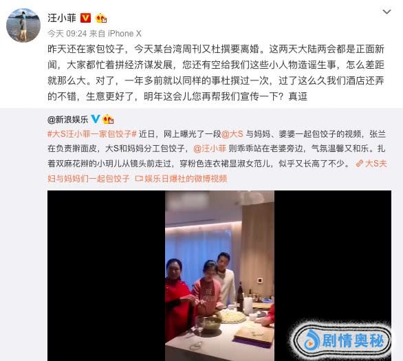 而汪小菲也在微博转发曝光的一段“大S汪小菲一家包饺子”视频,写道:“昨天还在家包饺子,今天某台湾周刊又杜撰要离婚。他还说:“对了,一年多前就以同样的事杜撰过一次,过了这么久我们酒店还弄的不错,生意更好了,明年这会儿您再帮我们宣传一下?真逗。”