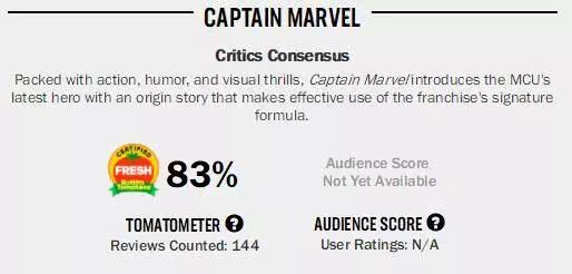 《惊奇队长》已在美国举行了首映,烂番茄新鲜度是根据首批媒体观众的评分计算而来,基于144个专业评价得出。