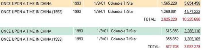 因为功夫皇帝香港的票房不高,以至于很多人一直用质疑的眼光来看李连杰,小编可以很负责任的说90年代除了成龙没有一人的票房能高过李连杰,碟片市场他更是无敌是华人中最卖座的。上图是《黄飞鸿》北美的录像带和DVD出租成绩,VHS出租超过1000万美元,DVD出租超过340万美元,这只是是2001年的数据,都发行好多次了还能有这么好的成绩,就问你服不服。