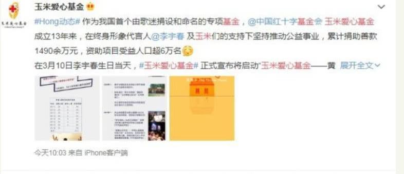 3月10日这天是春春的生日,这一天她再次向玉米爱心基金捐款了100万元,同时该笔善款首批被投入到“玉米爱心基金——黄房子”的建设中。广大网友纷纷表示敬佩和支持,这样的偶像带着这样的一群粉丝做对社会有意义的事情,尽自己最大的力量帮助需要帮助的人,真的值得赞扬和鼓励。
