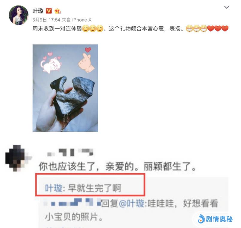 近日,娱乐圈的大喜事就是国民最爱的圆脸女星赵丽颖生娃了。虽然没有看见过大肚子的颖宝,但是孩子就直接生出来了。保密工作相当到位。当然更到位是应该就是这位了。叶璇3月9日晒收到的摆件,是个连体婴。然后有粉丝说:你也该生宝宝了,赵丽颖都生完了。叶璇的回应简直太爆炸:早就生完了啊。