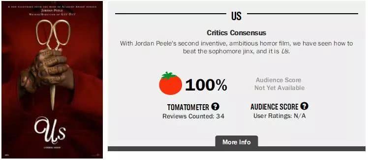 而在向来评分苛刻的MTC平台,《我们》的评分则高达82分,《逃出绝命镇》在这个平台的评分为84分。