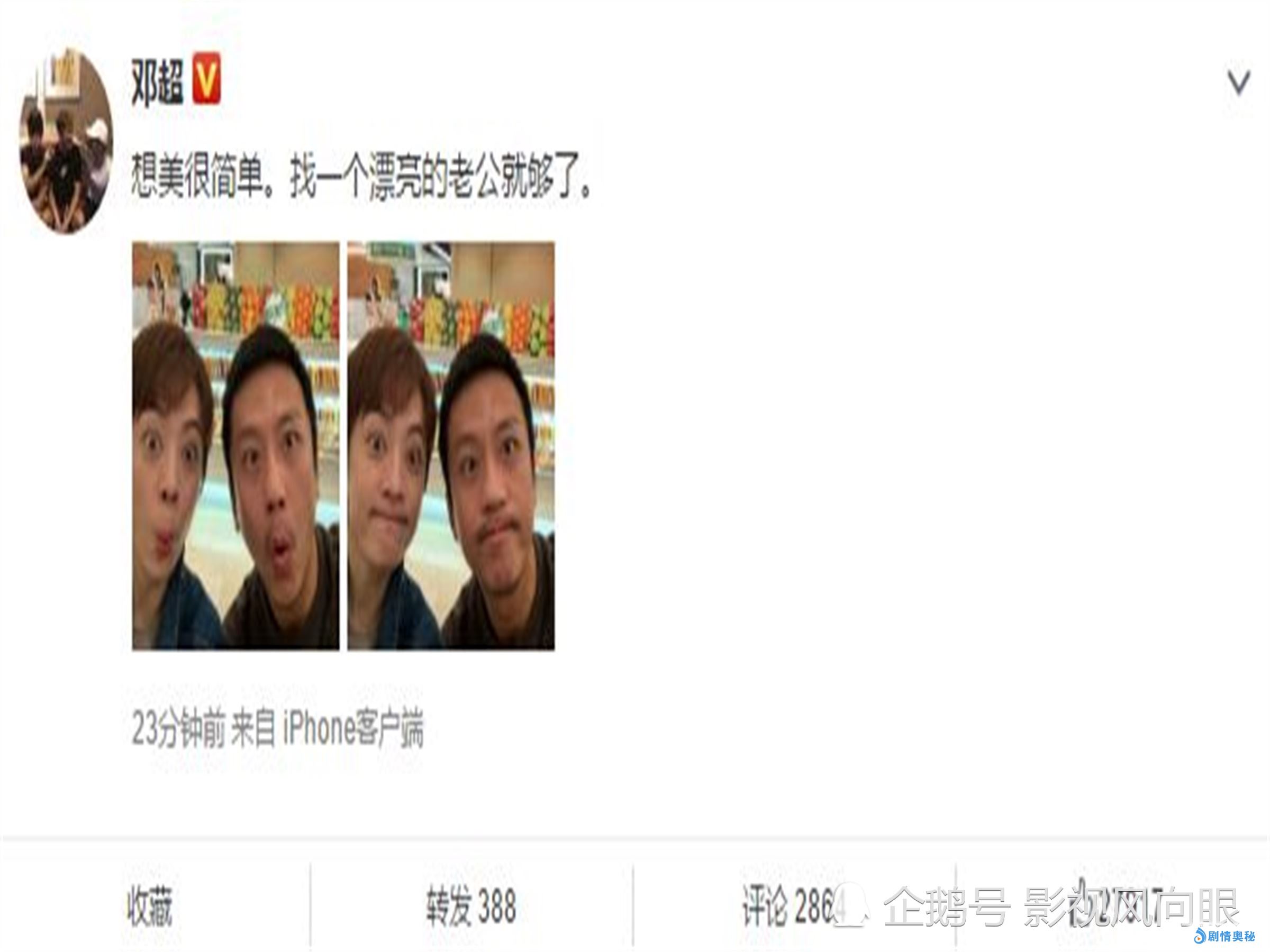 邓超经常在网上晒出自己的家庭合影,不仅有和儿女互动的照片,最多的也是和老婆孙俪之间的搞怪照片,最近邓超又一次晒出了和孙俪的搞怪合照,在照片中两人的表情神同步,并且配有自己的感慨:想美很简单,找一个漂亮的老公就够了。