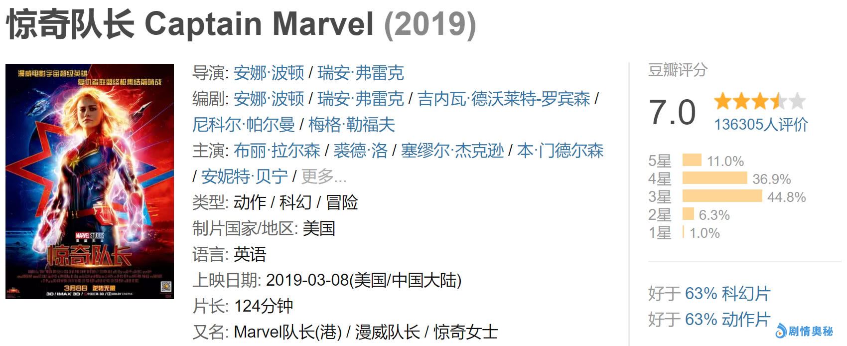 然而,这部《惊奇队长》的评分并不是太令大家满意,在豆瓣电影上,这部《惊奇队长》的评分仅仅为7.0分,这样的评分在最近上映的几部漫威电影中算是比较低的了,并且这个评分还在进一步下跌中,很快就可能会跌破7分了。