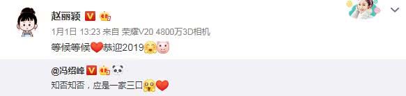 2019年1月1日,元旦佳节之际,冯绍峰更新微博,首次承认赵丽颖有身孕:“知否知否,应是一家三口!”赵丽颖也转发并说:“等候等候,恭迎2019!”