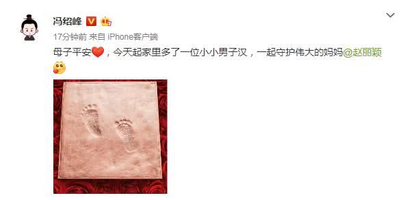 冯绍峰微博文案:“母子平安,今天起家里多了一位小小男子汉,一起守护伟大的妈妈!”