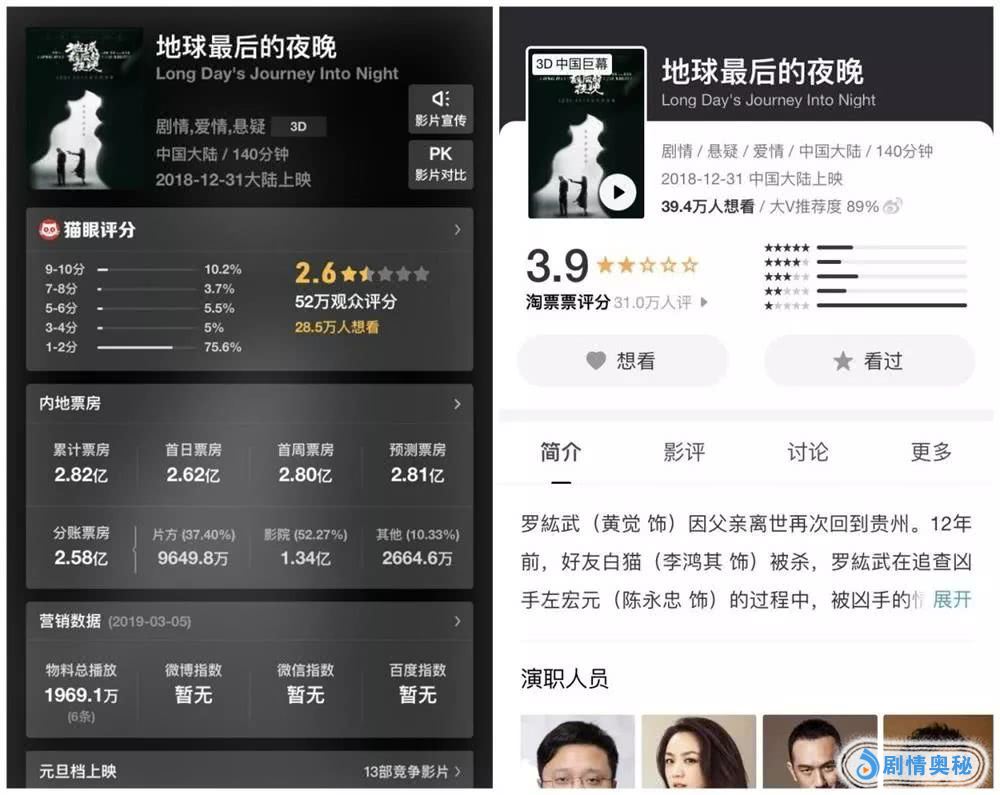 另外,2018年末上映影片《地球最后的夜晚》在“一吻跨年”噱头的营销下,虽然预售票房迅速破亿,却在影片上映后遭遇低分差评,在猫眼和淘票票上评分分别为2.6和3.9,此分数与本片在豆瓣上的6.9的评分产生了巨大差异。