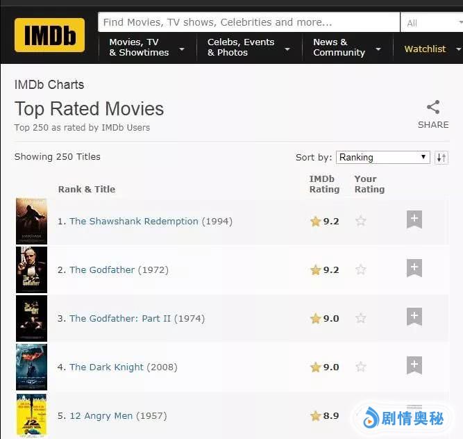 当然,对大众用户最有用的,就是IMDb的评分和其特色:IMDb历史前250名电影片单了。(只有供影院播出的影片可以参加评选,而短片,纪录片,连续短剧和电视电影不在其列)