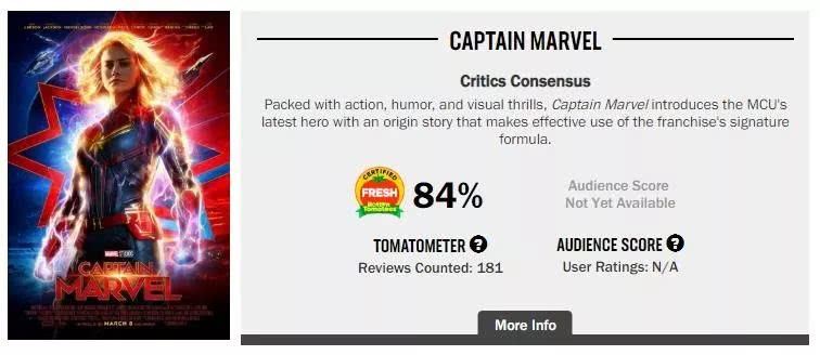 目前《惊奇队长》在经历了刷差评风波之后,媒体口碑已正式解禁,新鲜度达84%(181评153鲜28烂),延续了以往漫威电影的优良佳片水准。