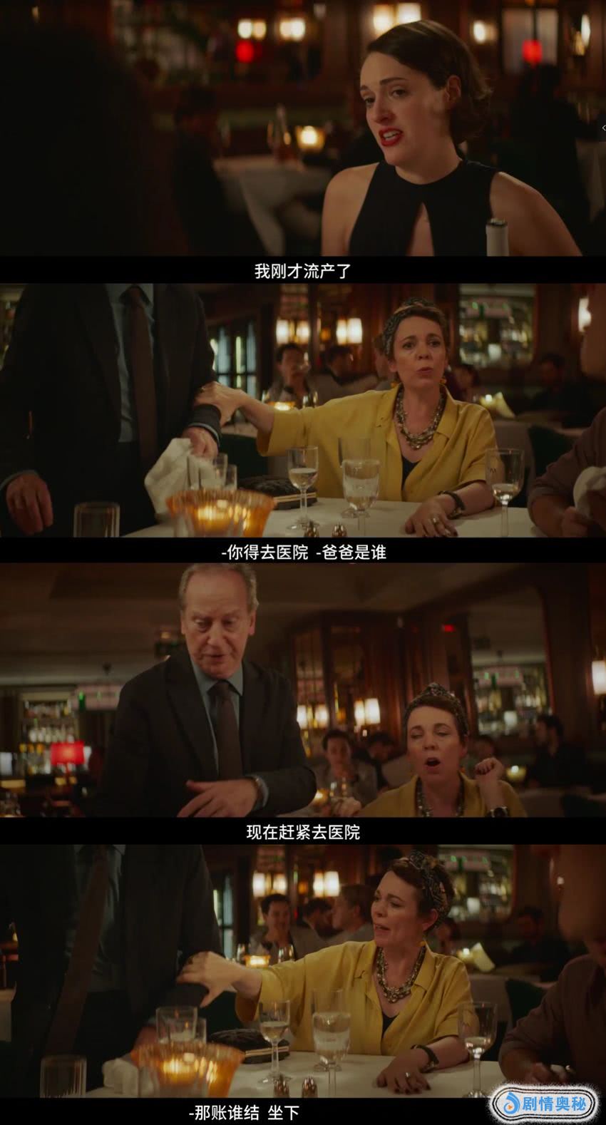 ∆ 刚刚,是姐姐在厕所流产了。但姐姐为了维持幸福女人形象,假装什么事也没发生。Fleabag只能说自己流产了,结束这个荒诞的家庭聚会。继母第一反应是,孩子的爸爸是谁?第二担心的是,Fleabag要是此刻去医院了,谁来结账?