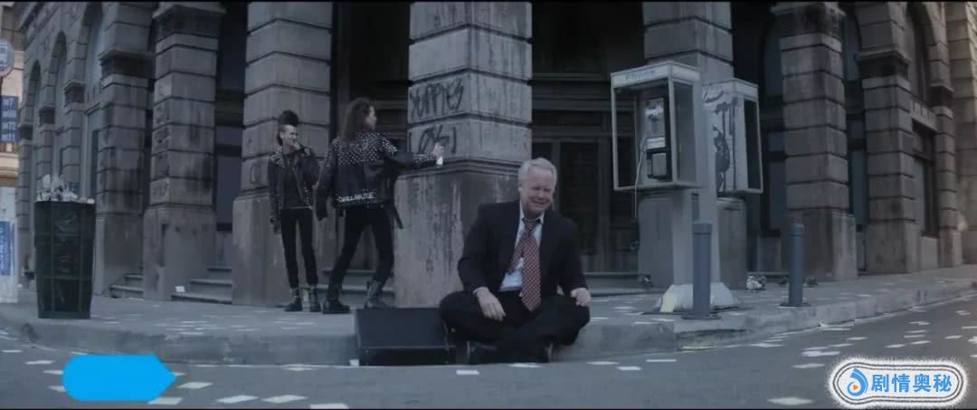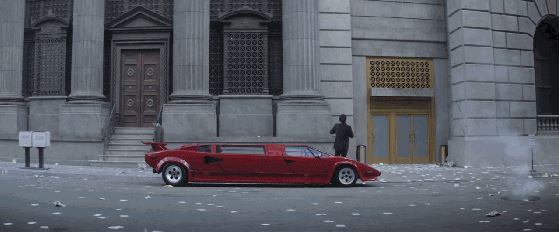 下一个镜头,一个人从高处坠落直接砸烂了一辆停在路边的加长版豪华兰博基尼的车顶。