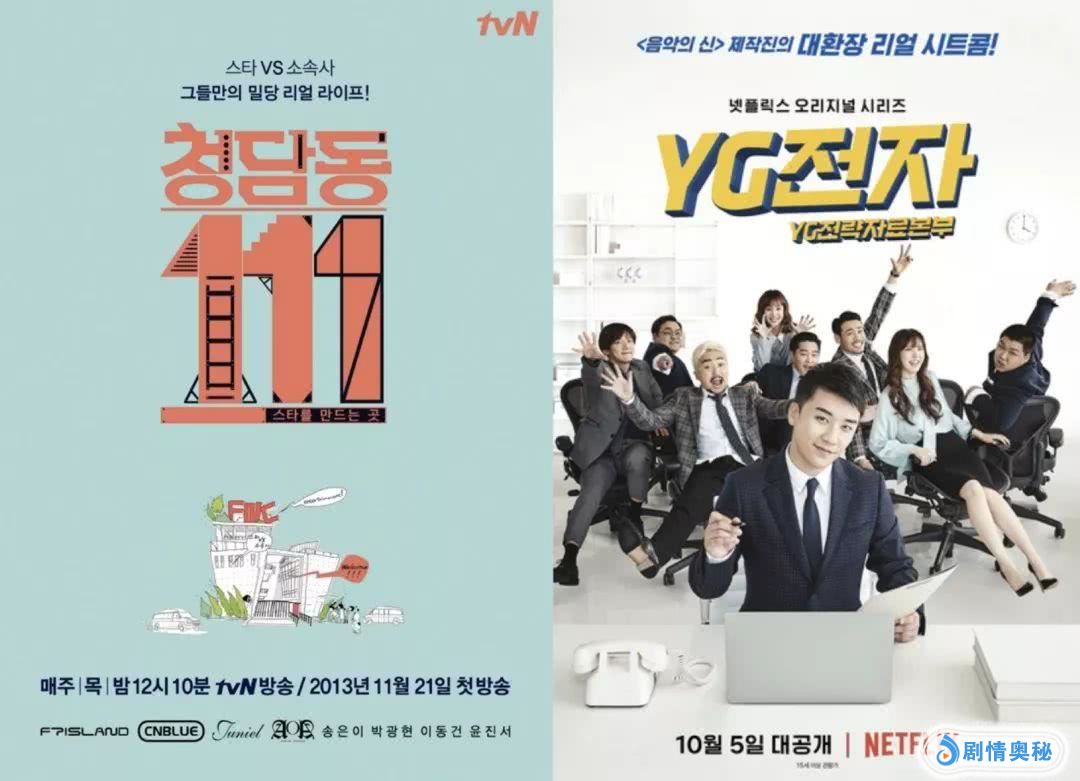 以综艺节目带动公司宣传,前有FNC在2013年推出的、在真实情景下设置情景剧《清潭洞111》,后有YG协同Netflix拍摄的、喜剧化呈现公司黑料的《YG战略资料本部》。