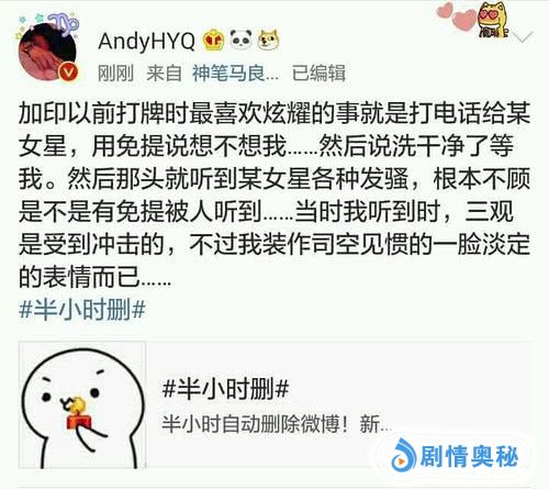 而去年6月份,黄毅清也发微博爆料暗指范冰冰,他说“加印以前打牌时最喜欢炫耀的事就是打电话给某女星,用免提说想不想我……”