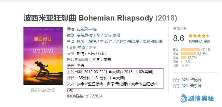 在今年第91届奥斯卡金像奖上《波西米亚狂想曲》获得了五项提名,拿下了最佳男主,最佳音效剪辑,最佳剪辑,最佳音响效果四项大奖。电影上映后在全球范围内获得了空前的好评。IMDb评分8.1,还没有上映的内地市场,豆瓣一度给出了8.9分,目前有超过10万人打分,还能在8.6分!