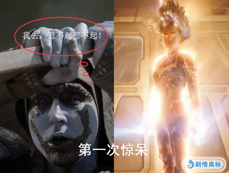 罗南的第一次惊呆由惊奇队长造成(从时间关系上)。这可能有些剧透,罗南惊呆的原因是目睹了惊奇队长的夸张的实力。可想而知,罗南虽然好战,但也有自知之明,他很清楚这个女人的力量绝非自己能够对抗的。
