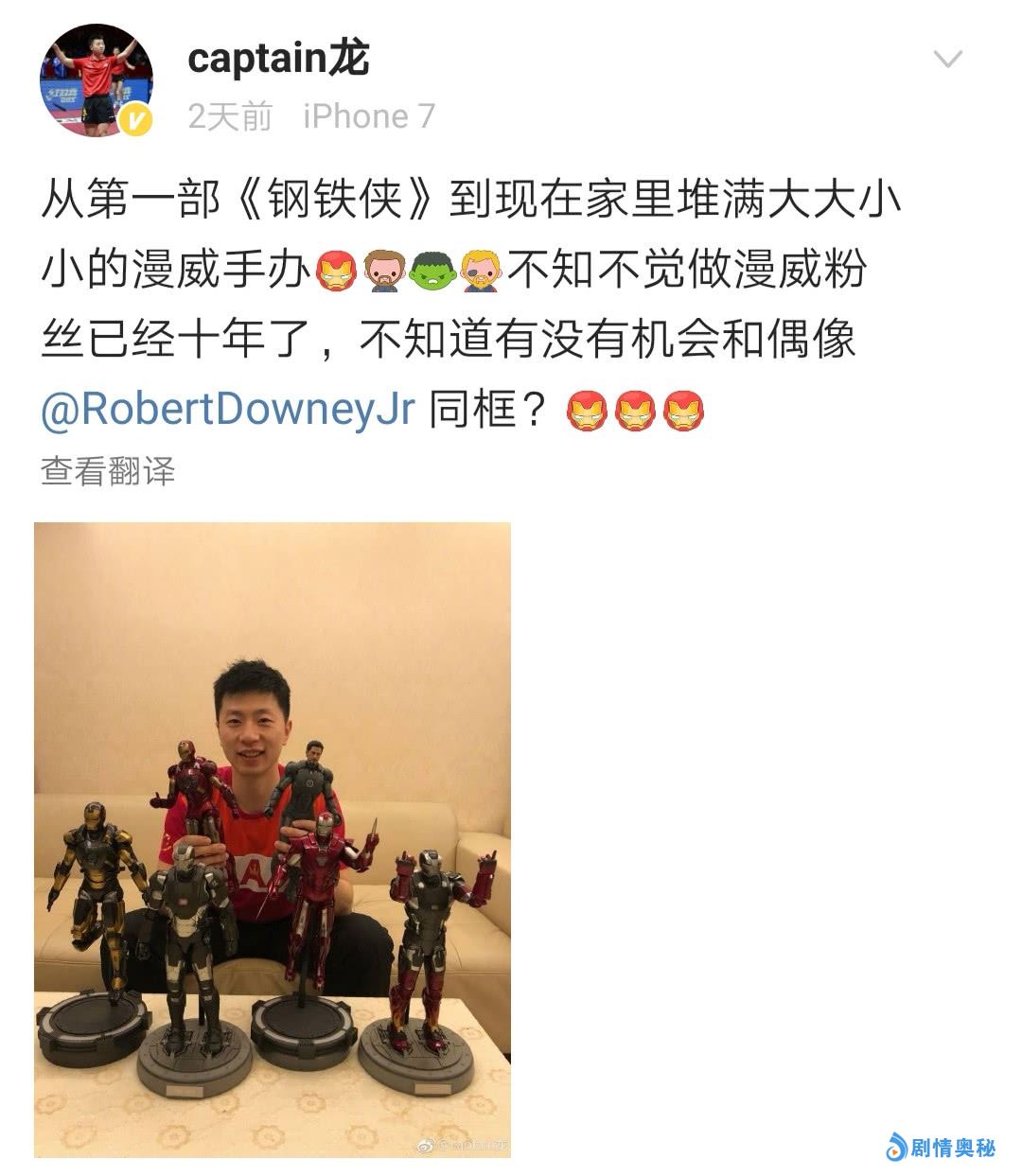 钢铁侠即将离去,粉丝们也是十分不舍,乒乓球国手马龙也在微博上晒出了他的钢铁侠手办,曝光了自己10年粉丝的身份,还希望能够和唐尼合影,确实是真爱粉了。