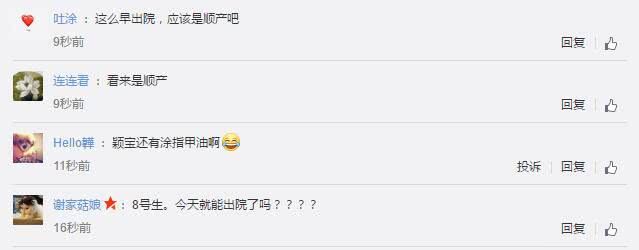 对此网友们表示,这么早就出院,应该是顺产。更有网友发了哭笑不得的表情问道:颖宝还有涂指甲油啊。对于怀孕生孩子坐月子,女明星们总是一次一次打破普通人的认知。