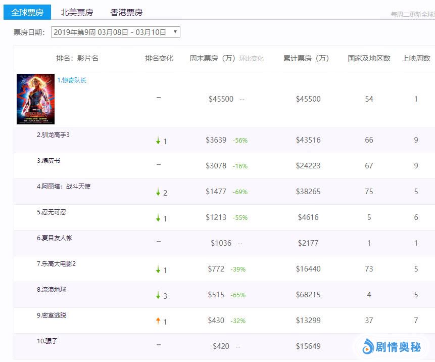 截至3月10号2019年全球第9周周末票房已经出炉,《惊奇队长》毫无意外夺得冠军