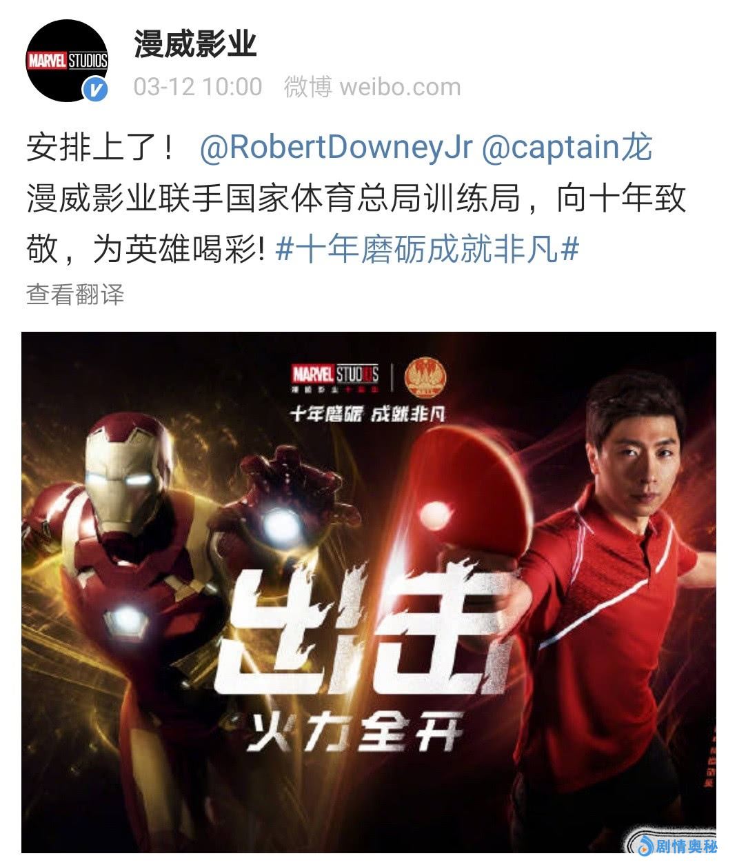 钢铁侠本人小罗伯特·唐尼也看到了这条消息,他随后也转发了这条动态,回复了马龙,希望可以实现同框,满足龙队的追星梦想。此外,钢铁侠还向漫威影业隔空喊话,这件事能不能给安排了?