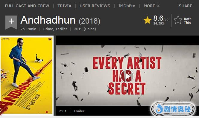 电影《调音师》同样不负众望,剧本相当完善,故事超级精彩,一路反转并脑洞大开,烧脑程度让观众肾上腺素飙升,深受全球影迷喜爱,IMDB评分飙到8.6分,成为去年IMDB评分最高的印度电影!