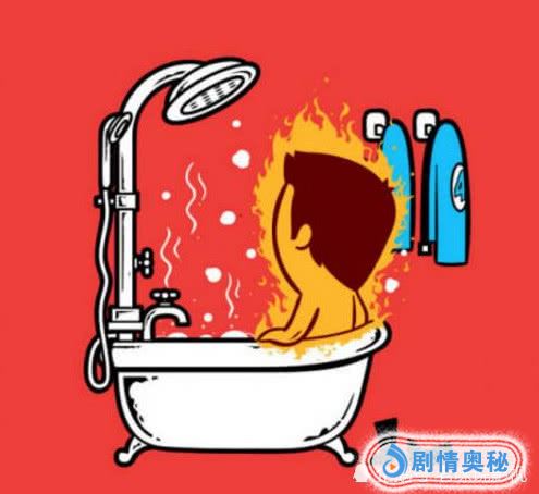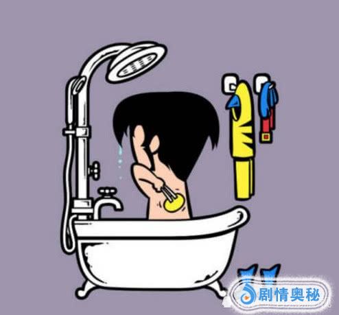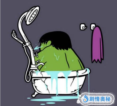 看到这身绿皮肤和挂在墙上的第一神器裤衩,不难猜出是浩克了,不过这大块头在一个浴缸里洗澡真的好吗,浴缸都被他撑破了,从看他的背影上有点滑稽。