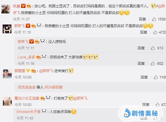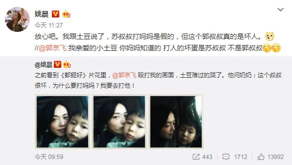 而当姚晨更博(3月12日)同情明玉的遭遇时,求生欲极强的郭京飞立马上线示好想要挽回自己好人的形象。“我亲爱的小土豆 你妈妈知道的 打人的坏蛋是苏叔叔 不是郭叔叔,”语气认真地表示角色是角色,演员是演员,两者不能混为一谈。