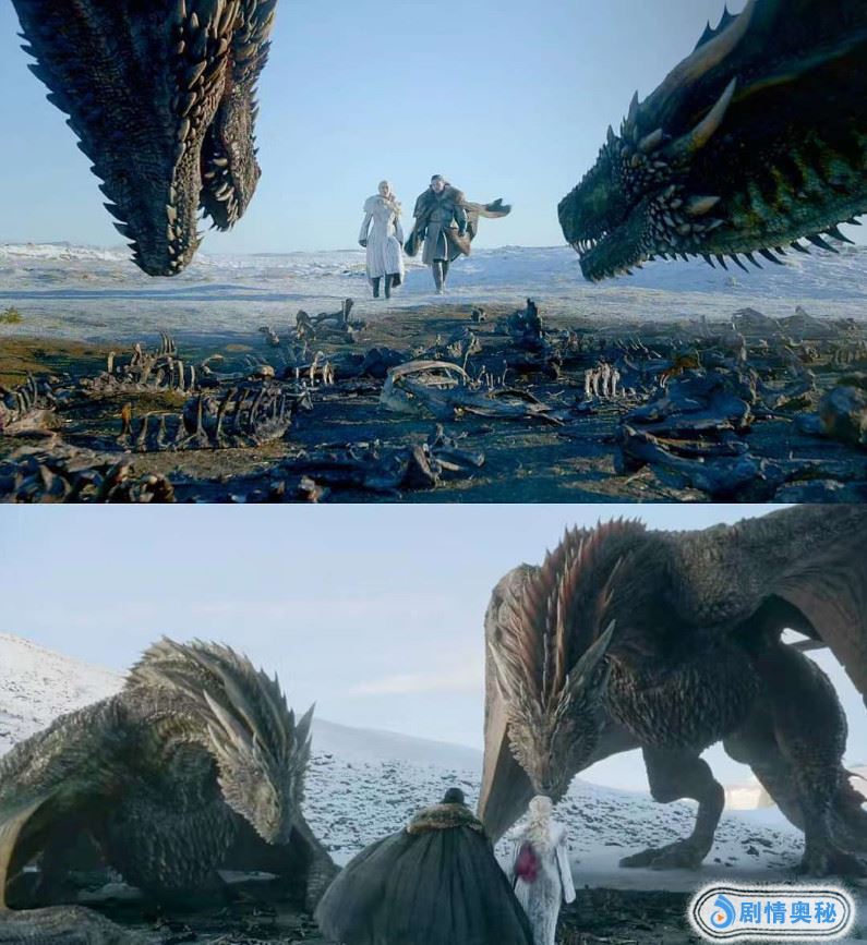 可以说,这是我们一直在等待的时刻!1分24秒,琼恩·雪诺和丹妮莉丝·坦格利安走向两条龙:卓耿和雷哥。这个地方的背景有点荒凉,没有马,除了骑龙之外应该没有其他的代步工具了。龙母丹妮莉丝骑过卓耿,但根据外媒网友的统计,她还没有骑过雷哥。如果琼恩骑上它那将是一个充满寓意的时刻,因为雷哥(Rhaegal)是以他父亲雷加(Rhaegar)的名字命名的。