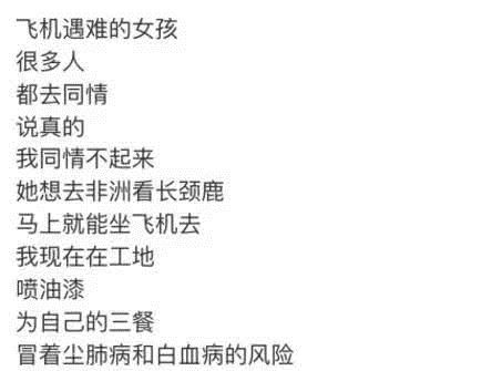 “当我看你住着几千块钱一晚的酒店,每天锦衣玉食,看个长颈鹿都要去非洲的时候,虽然我不会幸灾乐祸,但也绝对同情不起来。”