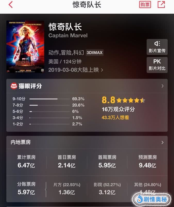 然而有趣的是,尽管《惊奇队长》势头凶猛,但某专业票房软件却在周末过完后调低票房预测至9.48亿。上映3天票房近6亿,为什么《惊奇队长》票房还是不被看好?原因有以下几个方面。