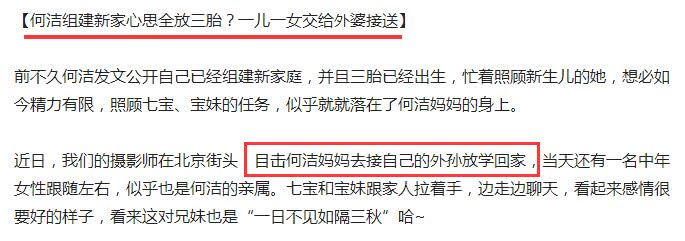 3月13号,据报道,何洁的妈妈最近去学校接七宝和宝妹放学回家,接到孙子和孙女后,何洁妈妈带领两个孩子准备打道回府,身边还有一个女士,应该是家里的亲属来来帮忙的。两孩子有说有笑的,开心和外婆一块回家。
